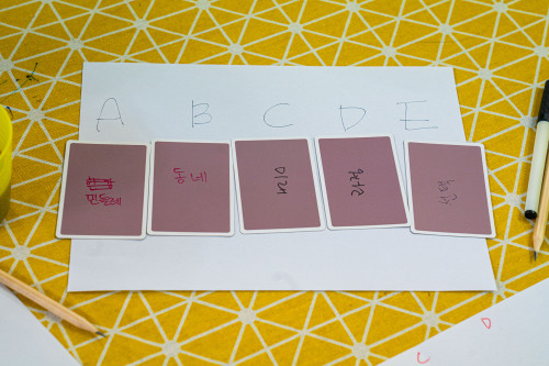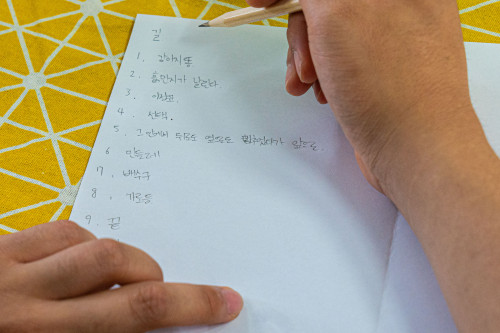 비슷한 방식으로 다른 주제어를 제시하고 ‘너도나도’ 게임을 몇 차례 해보았다. 과연 너도 나도 이걸 떠올리겠지 했던 추측이 여지없이 빗겨나갔다. 누군가는 남들과 너무 다른 자신의 사고방식이나 관점을 확인하며 조용히 웃기도 했다. 서로가 각자의 길 위에서 생각하며 단어를 적어보았지만 그 과정에서도 서로를 만나려 한다는 것을 발견했다.