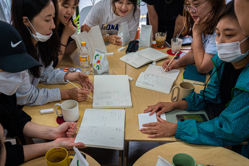“저는 연필, 지우개, 노트가 주는 부드럽고 편안한 느낌이 좋았어요. 맛있는 커피와 다과도, 이런 안전한 느낌의 공간도요. 감성을 자극했다고 해야 할까요. 일반 회의실에서 했으면 뭔가 초조했을 것 같아요.”