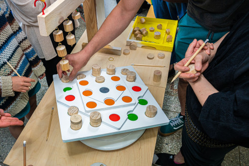 그러다 알록달록하고 넓직한 판이 있는 저울을 이용해 이야기를 해보기로 했다. 판에 파여진 홈에 나무 조각을 올려놓으면 판은 기울어진다. ‘집’과 관련하여 각자가 중요하게 생각하는 것을 나무 조각에 단어로 적고 판 곳곳에 올려놓으며 이야기를 이어갔다.